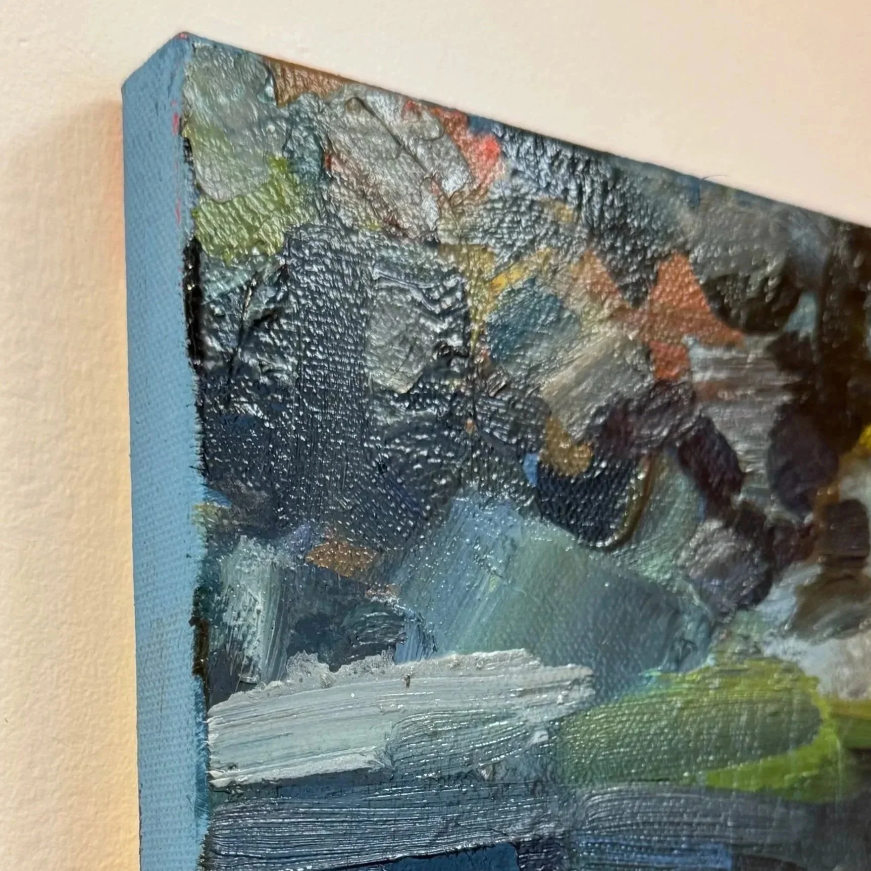 Imagine a painting with bold black contours, the edges might be painted black to echo those lines, bringing cohesion to the entire piece. Or a landscape with deep blue tones might have navy-painted edges that tie everything together with a subtle contrast. Or maybe it’s a modern abstract that is painted neon at the edges for a dissonant juxtaposition. However you do it, the result keeps the artwork contemporary and unframed just with a slightly more composed feel.